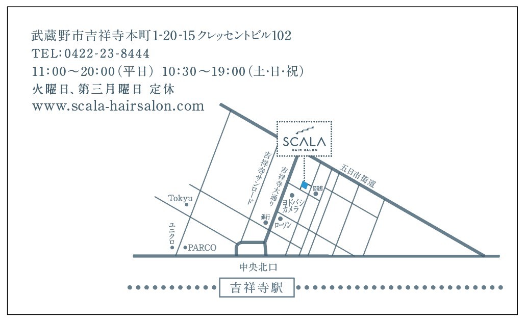 ヨドバシカメラを右手にヨドバシカメラの奥側を右に曲がると、20mほど先の左手にスケートボードショップがあります。そのスケートボードショップの奥隣りが当サロンになります。